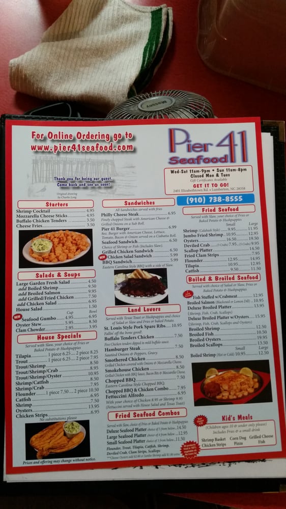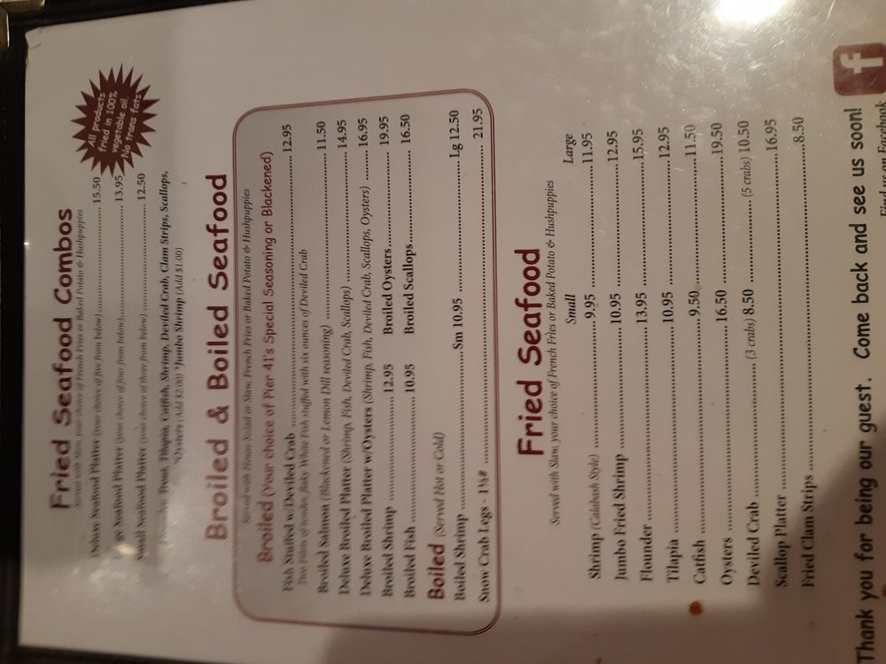 Welcome to Pier 41 Seafood, your destination for delicious American-style seafood in Lumberton, NC. This casual eatery offers a delightful menu featuring a variety of fried combination platters that let you choose your favorite seafood items. Options range from the Small Seafood Platter, featuring three selections for $17.95, to the Deluxe Seafood Platter with five varieties for just $21.95, all served with hearty sides of potatoes, slaw, and hushpuppies.